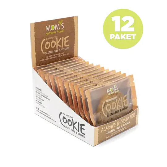 "High-fiber, flavored with apple juice and baked with extra virgin olive oil, Mom's gluten-free cookie flavors are with you whenever you need them. 12 Pieces of Almond & Cacao Cookies 12x50g What's Inside? Apple Juice + Oat Flour + Coconut + Extra Virgin Olive Oil + Almond + Cocoa + Flaxseed + Cocoa Nibs + Vanilla Oil + Salt"